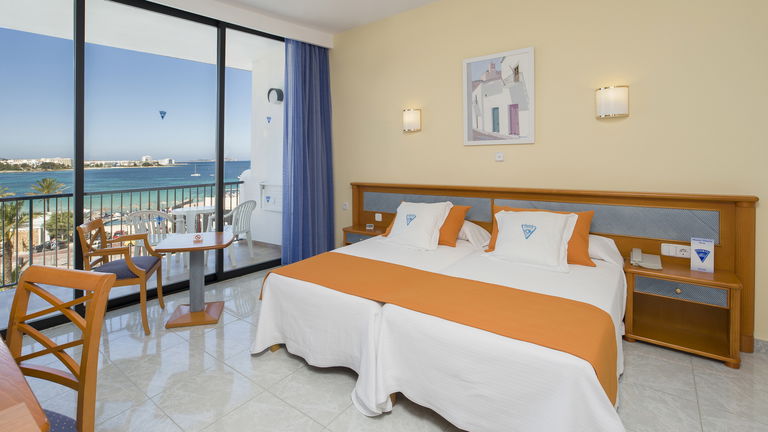 Habitación doble con balcón con vistas al mar, 2 camas individuales o 1 cama doble (queen size), aire acondicionado, ventilador de techo, mini refrigerador, televisión de 32 'por satélite, baño con secador de pelo.